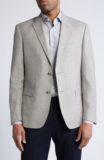 A textured blend of wool and linen woven in a pale beige brings comfort and versatility to a sport coat styled to elevate any warm-weather look.
