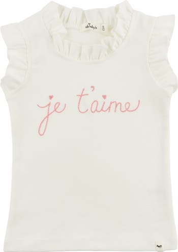 Adorable meets effortless in this oh baby! Rebekah Tank Top. Soft cotton construction keeps little ones comfortable all day, while the charming "je t'aime" embroidery adds a touch of je ne sais quoi. Playful ruffles frame the neckline and armholes for that signature oh baby! polish. Perfect for layering or wearing solo, this oyster-hued essential brings French-inspired sweetness to any outfit. Available in infant, toddler and girls sizes. Designed in Minnesota.