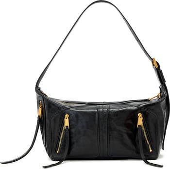Exposed zippers glimmer against the leather of an everyday shoulder bag featuring a softly structured rectangular silhouette.