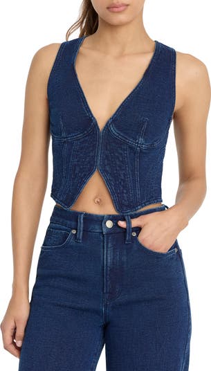 With the look of denim and the softness of French terry, this daring vest features a plunging neckline, contoured seams and a figure-hugging fit.