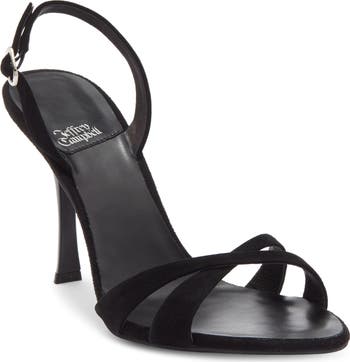 Tapered straps crisscross over the slender toe on a slingback sandal lofted by a svelte heel.