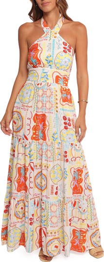 This maxi dress cut in a shoulder-baring silhouette is covered in vibrant pattern reminiscent of your time spent along the Italian countryside for ultimate warm-weather vibes.