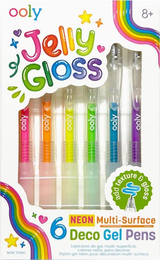 OOLY: JELLY GLOSS NEON MULTI-SURFACE DECO GEL PENS - SET OF 6 - Give your crafts a glow-up with the Jelly Gloss Neon Multi-Surface Deco Gel Pens! This set of six neon gel pens is perfect for adding bold, raised designs that stick out (literally). They work wonders on glass, plastic, and other non-porous surfaces—perfect for turning jars into jam-packed party decor or customizing phone cases to make them totally “case-tomized.” Not stopping there, these multi surface pens dazzle on black and white paper, making even your doodles pop with pizzazz. Featuring retractable tips and a comfy grip, these pens put the “fun” in functional. The glossy, dimensional ink adds a raised texture that makes every design feel like a masterpiece—just give it a minute to dry before you show it off. Whether you’re jazzing up gifts, sprucing up party crafts, or turning everyday items into objects d’art, these deco pens are the perfect pick for craft enthusiasts who like their projects bold and brilliant. HI, WE'RE OOLY! We love creating whimsical and colorful products that spark imagination and inspire self-expression and ultimately make people of all ages smile! Headquartered in Carlsbad, California, OOLY passionately delivers quality arts, crafts and school supplies that inspire creativity and self-expression, inviting you to Create Your Happy.