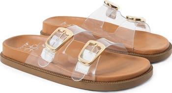 A duo of translucent jelly straps secure this sport-inspired slide sandal featuring a cushioned footbed for all-day comfort.