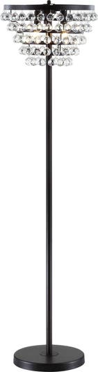 Large crystal droplets catch the light, enhancing the shimmer of this stunning floor lamp and adding timeless elegance to any room. With the shade hanging in five tiers, this floor lamp gives the effect of a chandelier without the hard-wired installation or required high ceilings. At 60" tall, the scale is perfectly suited for a living room or bedroom.