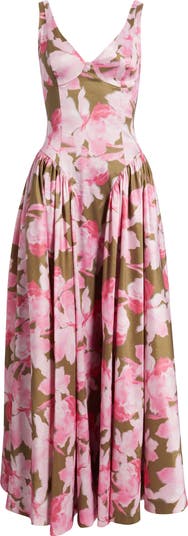 Defined cups and a basque waistline amplify the romantic appeal of a satin maxi dress covered in a floral print that serves up ultimate garden-party style.