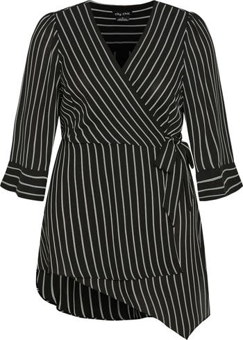 Wide, flowy sleeves frame this wrap-style tunic covered in fierce leopard spots, fastened with a tie at the waist and cut with an asymmetric hem.
