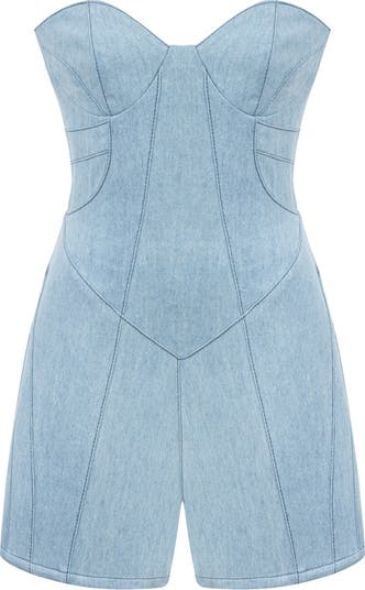 Fashioned from denim Marvel mini jumpsuit is a standout piece. Featuring a sweetheart neckline and the corset shape designed to accentuate your naturel curves. A metallic zip closure extends on the back. This jumpsuit exudes effortless charm in nesta blue color.