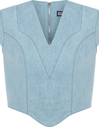 Expertly crafted from nesta blue denim, our Marvel top boasts stylish voluminous shoulders and elegant V neck parallel with waist that effortlessly elevates any ensemble. A metallic zip closure extends on the back add subtle flair
