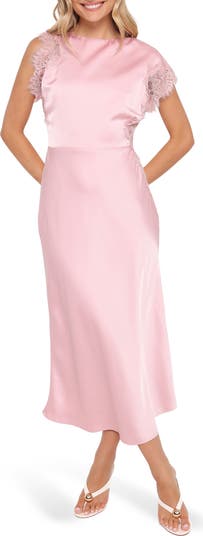 Slinky satin and delicate lace trim amp up the romance of this party-ready cocktail dress cut in a figure-skimming silhouette.