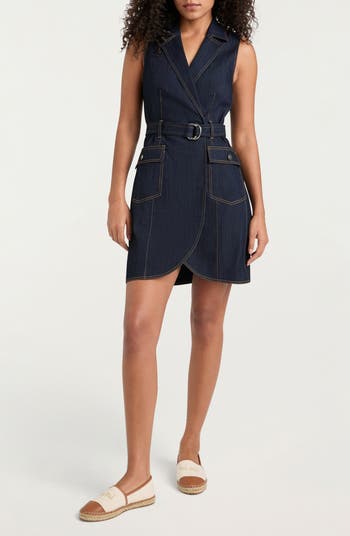 Bring dark-rinsed denim to dress day in a sleeveless option traced in topstitching and perfected with a pair of pockets.