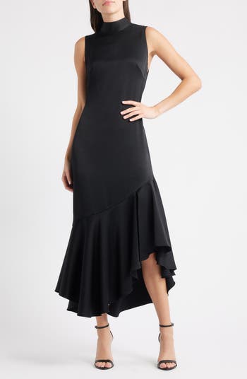A bias-cut ruffled hem adds graceful movement to this sleeveless maxi cut from glossy satin and topped with a sophisticated mock neck.