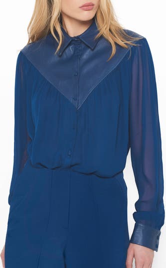 The Jenna Blouse is crafted using our structured stretch twill fabric in Navy and the contrasting yoke is made with our buttery stretch lambskin. These tailored, best-selling beauties have a fluid wide-leg silhouette with a high waist and front and back contrasting leather yoke. Jenna Trousers is ready for a night out or a date at an Art Gallery. Pair with our Jenna Blazer and Jenna Top for a full ready to wear look. This style runs relaxed. Please order your normal size. If you are between sizes, we suggest sizing down for a more fitted look, or sizing up for added comfort. - Our commitment to sustainability: We are plastic free. AS by DF packaging is made from 100% recycled materials and is 100% biodegradable.
