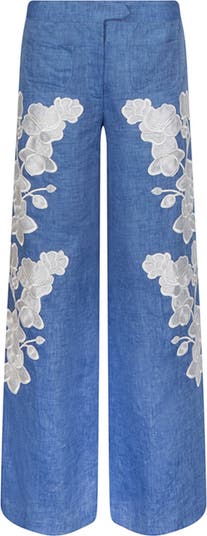The JENNA, a luxurious blue linen wide leg pant adorned with delicate white embroidered flowers.