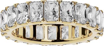 Sleek prong settings punctuate the elegant array of emerald-cut diamonds shimmering on this 18-karat-gold eternity band.