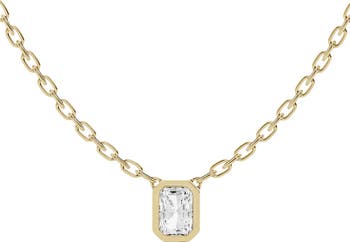 A chunky link and an eased square shape strike a modern mood for a pendant necklace hung with a single, flashing lab-created diamond.