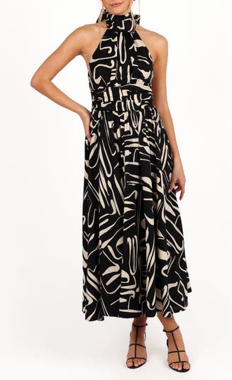 Sway with every step (and twirl when necessary) in this boldy printed maxi designed with sleek cutaway shoulders and a flowy flared skirt.