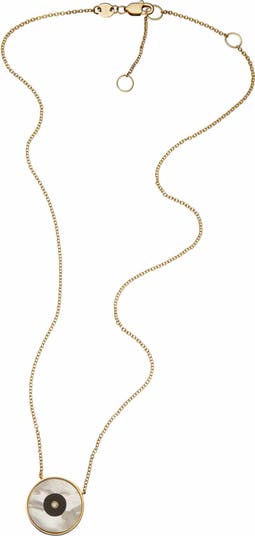 A diamond sparkles within two rings of stone on this modern evil-eye pendant necklace made of sterling silver and plated in 14-karat gold.