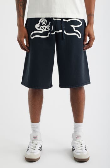 A bold running-dog logo sprinting across the thighs brings stark contrast to these comfy drawstring-waist shorts cut from all-cotton French terry.
