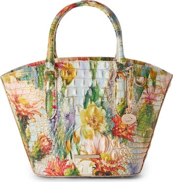 Glazed croc-embossed leather highlights the curved profile of this scaled-down version of the label's Jeanne tote. Signature Brahmin touches—including an array of pockets, light-colored lining and a convenient key clip—add to the bag's versatility.