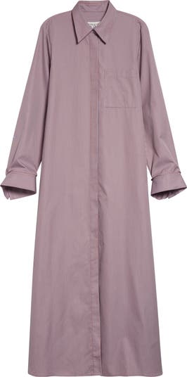 A hidden-button placket and nearly invisible seams give a streamlined look to this crisp cotton shirtdress that's updated by a single patch pocket at the chest.