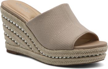 Polished pyramid studs and woven jute elevate the chunky platform and wedge heel of an espadrille-inspired sandal set on a cushioned footbed for added comfort.