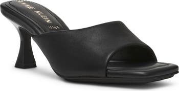 A squared-off toe and flared kitten heel balance a minimalist slide sandal set on a cushioned footbed for comfortable wear.