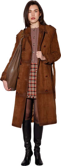 The Jerome Trench is our take on the classic staple. In our rich suede quality, this double-breasted look with buttons features treated seam details and self belt waist.