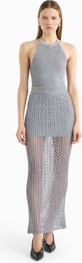 The Jerri skirt pairs intricate sequin crochet with a soft inner mini slip, creating a textural maxi silhouette with graceful movement.