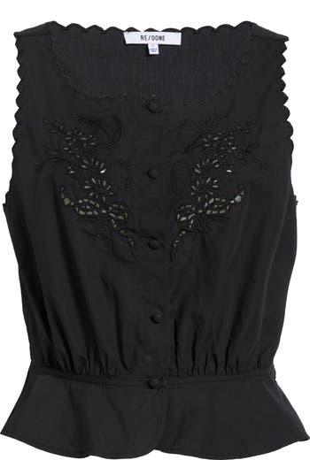 Airy embroidered eyelets enhance the breathable charm of this cropped tank cut from lightweight cotton and finished with a frilled hem.