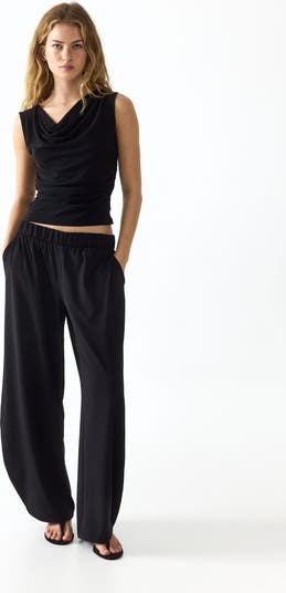 Pants in stretch jersey. Elasticized waistband, side-seam pockets, and balloon legs, tapered at hems.