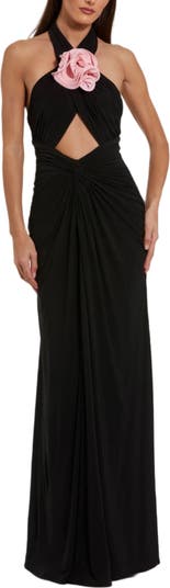 Jersey crossover halter neck gown featuring a 3D flower detail, combining sleek elegance with a touch of floral charm for a standout look.