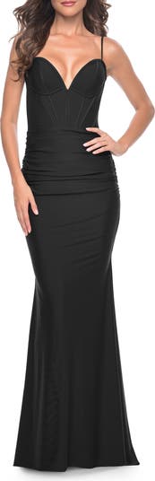 Bustier jersey dress with an illusion net back and ruched skirt. Back zipper closure.