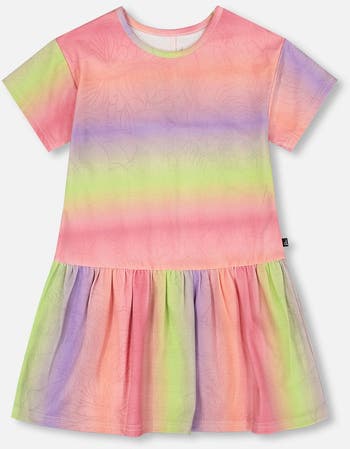 This printed jersey dress with heart-shaped back cut out in multicolor is a playful piece from the “Wild Heart” collection. This dress features short sleeves, a round neckline, a drop-waist skirt, and a fun rainbow effect print that brings cheerful energy to summer days. At the back, a heart-shaped cutout adds a sweet finishing touch to this soft organic cotton design.