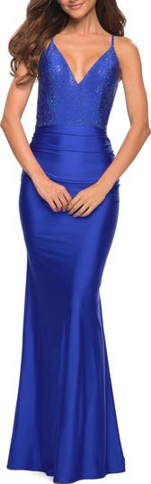 La Femme Jersey Dress with Rhinestone Beaded Top and V Neck, Main, color, Royal Blue