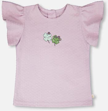 Fresh and playful, this jersey t-shirt in lavender is a sweet everyday essential. Designed with flutter sleeves, a round neckline and a delicate clover print on the chest, this tee is made from a soft fabric with a pique dots texture for breathable comfort. A versatile piece that pairs beautifully with charming bottoms from our "Clovers And Violets" collection.