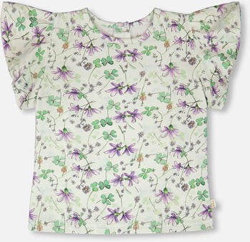 Fresh and playful, this jersey t-shirt green with printed flowers is a sweet everyday essential. Designed with flutter sleeves, a round neckline and a delicate allover flower and clover print, this tee is made from a soft tencel-rayon blend for breathable comfort. A versatile piece that pairs beautifully with charming bottoms from our "Clovers And Violets" collection.
