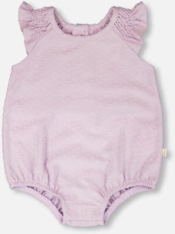 Delightfully sweet, this jersey romper in lavender brings charm and comfort to every sunny day. The romper features flutter sleeves, gathered detailing at the legs, bottom snap closure and a breathable fabric with a pique dots texture that feels soft against delicate skin. A lovely piece for little girls, it pairs beautifully with other items from our "Clovers And Violets" collection.