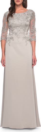 Long gown with jersey column skirt and lace bodice. High neckline and sheer lace sleeves. Back zipper closure.