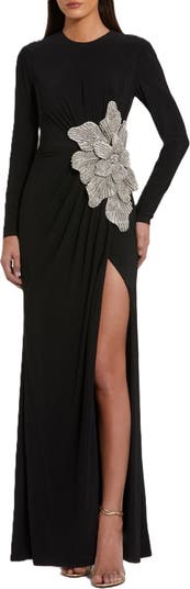 This jersey gown features long sleeves and a thigh-high slit for an elegant look. The embellished flower adds glamour, while the fabric ensures comfort and a flattering fit.