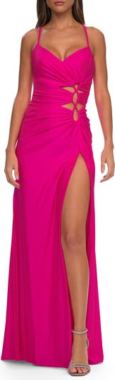 La Femme Jersey Long Prom Dress with Trendy Waist Cutouts in Neon, Main, color, Neon Pink