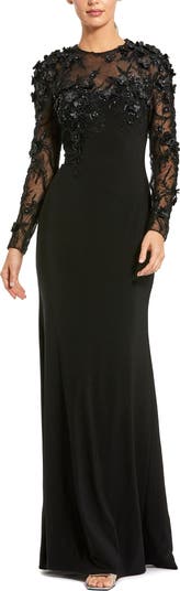 Timeless black column gown with illusion neckline, sheer sleeves, and hand-beaded floral appliqué—elegant and refined for black-tie galas and events.