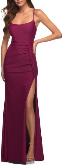 Polished long jersey prom dress with drape style slit and ruching throughout. Lace up strappy back and ruching along zipper. Back zipper closure.