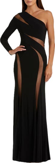 This sleek jersey gown drapes gracefully to accentuate curves, featuring an illusion cut-out and a one-shoulder design, perfect for formal events and black-tie affairs.