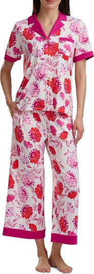 Slumber soundly or simply lounge in the soft and stretchy comfort of these jersey pajamas featuring a relaxed button-up and a pair of matching ankle-cropped pants.