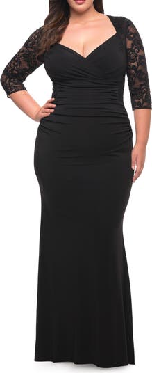 Jersey plus size gown with V neckline and three-quarter lace sleeves. Illusion lace covered back with back zipper closure.