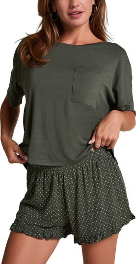 Unwind in style with our jersey pyjama set. The short feature an elasticated waist for a comfortable and secure fit, complemented by ruffles at the edge that add a playfull touch. Paired with a losse-fitted t-shirt, this set ensure maximum comfort and ease. Combine with your favorite slippers for a complete look.