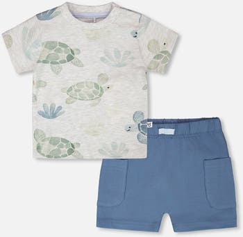 Fresh and fun, our jersey t-shirt and organic cotton shorts set grey mix with turtle print and medium blue brings a playful twist to everyday style. The top features a sweet allover turtle print with shoulder buttons for easy dressing, paired with solid medium blue shorts designed with side pockets for practicality. Made from soft cotton blends, this set keeps little boys comfy and ready for summer adventures.