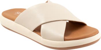 Wide, high-quality leather straps crisscross over the vamp of a minimalist slide sandal grounded by a foam-cushioned footbed with built-in arch support for optimal comfort.
