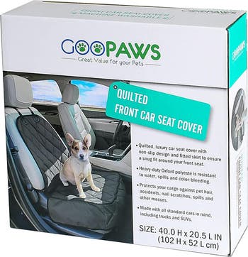 DUP QUILTED PET FRONT CAR SEAT COVER - 40"H x 20.5" L - It’s designed to fit most standard cars, including trucks and SUVs. This cover is easy to install as the straps fit over the headrests and tuck into the seat anchors. The non-slip design and fitted skirt mean it’ll fit snugly on your passenger seat. This will ensure your car front seat covers for dogs are totally secured in place. Protecting your car from the attention of your dirty dog. It also features an adjustable seatbelt to keep your paw-tner in place. Take your companion for a ride without having to worry about a mess with the JesPet Luxury Car Seat Cover. Made with high-quality heavy-duty polyester for durability. OVERVIEW: Foldable - Portable - Machine Washable - Waterproof - Anti-scratch!